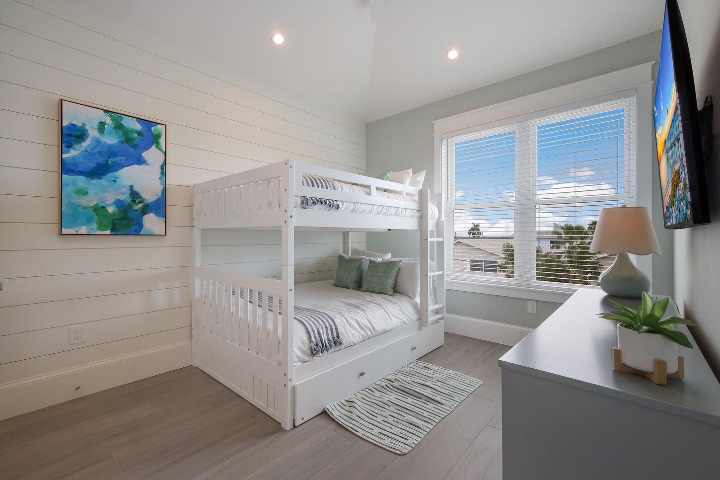 The primary suite boasts a king bed, stylish furnishings, and a luxurious ensuite with a double vanity, walk-in shower, and standalone tub, the ideal retreat for unwinding. Five additional bedrooms, each with king beds, TVs, and private ensuite bathrooms with walk-in showers, make travel with multiple families or groups effortless. The seventh bedroom features full-over-full bunk beds, perfect for kids or additional guests, along with an ensuite bath with a shower/tub combo. The two laundry rooms ensure you’re always prepared for beach, water, and fun-filled days.